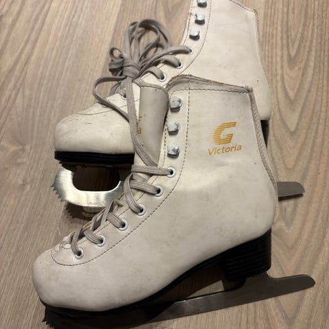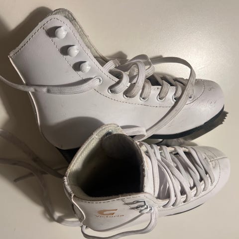 Victoria kunstskøyter for barn i størrelse 34. Klassisk hvit modell med høyt skaft og snøring for god støtte rundt ankel. Skøytene har stålklinge med hæl og er egnet til generell skøytebruk på isbaner og uteis. Passer til barn som trenger stabile skøyter til lek og enkel kunstløpstrening.