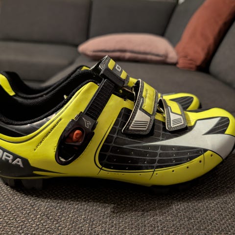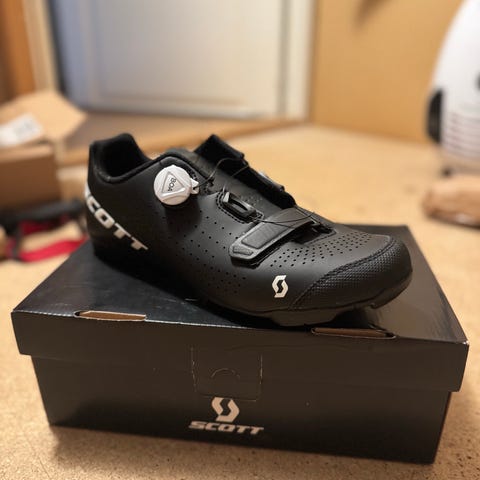 Scott MTB Comp Lady sykkel/spinning sko i størrelse 41. Modellen er til terrengsykling (MTB) og har såle tilpasset klikkpedaler med 2-boltsfeste. Skoene er i hovedsak svarte med lyse kontrastfelt og mesh-paneler for ventilasjon. Lukkes med borrelåsremmer over vristen for justerbar passform.
