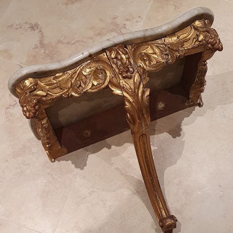 Rundt sidebord eller blomsterbord fra Italia (sies det) med marmortopp og underhylle. Bordet har en øvre og en nedre plate i marmor med naturfarget åremønster i gult og brunt. Understell i messingfarget metall med utskårne, dekorative detaljer langs kantene og på beina. Smale, buede ben med formede føtter gir et klassisk uttrykk.