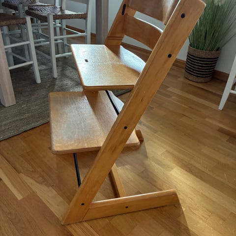 Eldre Stokke Tripp Trapp høy barnestol i tre med naturfarget finish. Stolen har justerbart sete og fotbrett som kan tilpasses barnets høyde. Egnet som spise- og sitteplass ved bord for barn. Klassisk design med god stabilitet og fotstøtte for barnet.