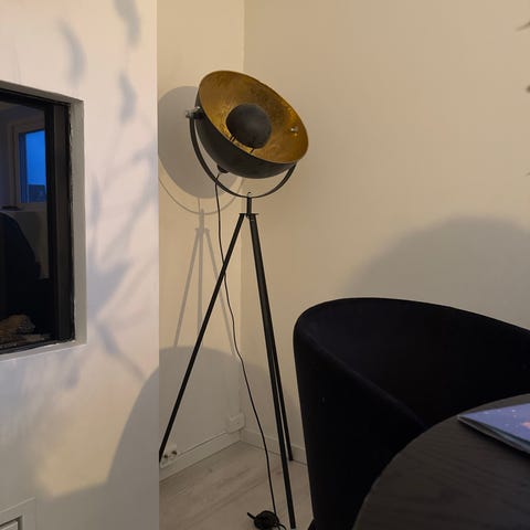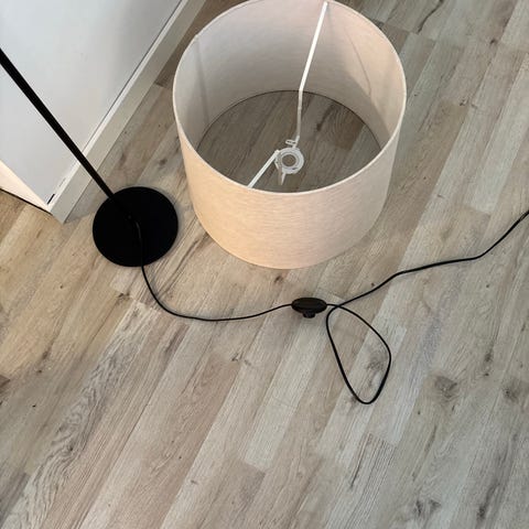 Lampen har en solid metallfot og en elegant beige lampeskjerm som gir et varmt og behagelig lys.