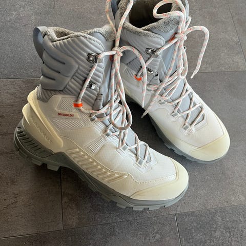 Viking vinterstøvler i størrelse 37. Støvlene er varme og vantette i hvit farge med grov yttersåle for godt grep. Overdelen er i syntetisk materiale og tekstil med forsterkninger på tå og hæl. Modellen har høy skaft med mykt, fôret innside for ekstra varme. Lukkes med snøring og justering foran. Passer til bruk i kaldt vær og på vinterføre.