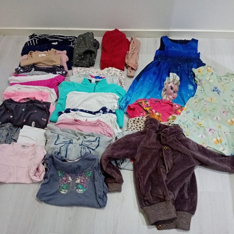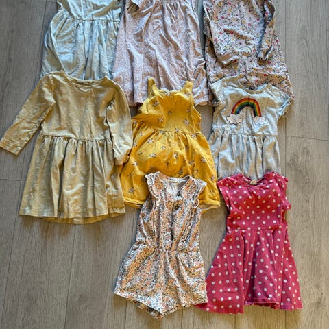 Gensere, singletter, tskjorter, tights, bukser, korterma kjoler, langerma kjoler, kose-heldress, strømpebukser, sokker og en fin sommerjakke