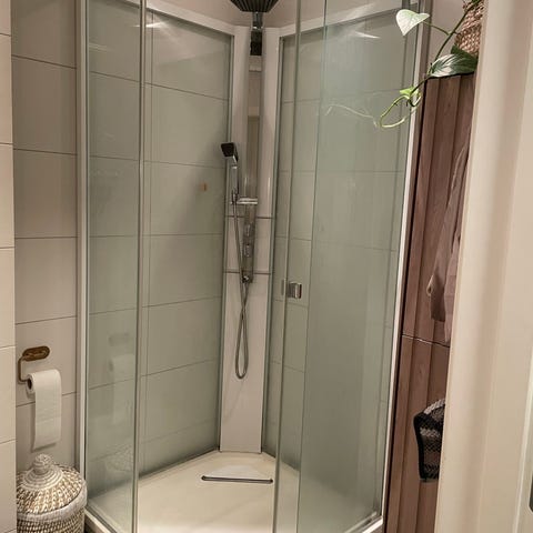 Dusjkabinett med skyvedører i klart glass og profiler i metall. Kabinettet har hjørneinngang med håndtak på dørene. Egnet for montering i hjørne på bad med flislagte vegger. Passer til vanlig dusjarmatur montert på vegg.