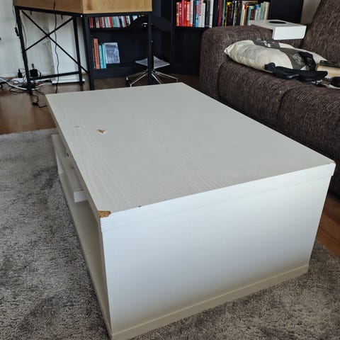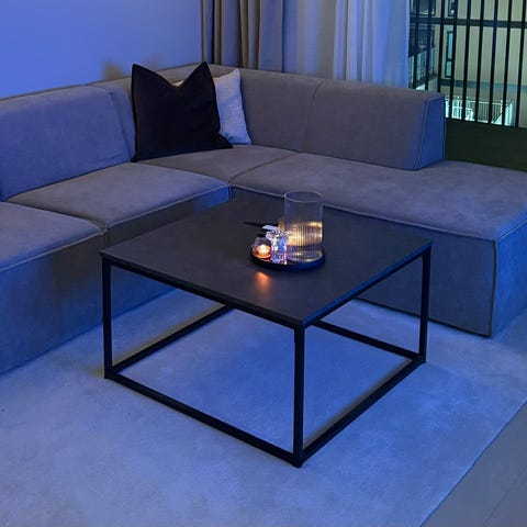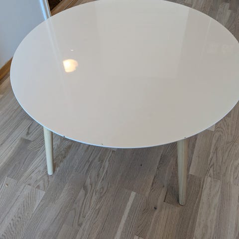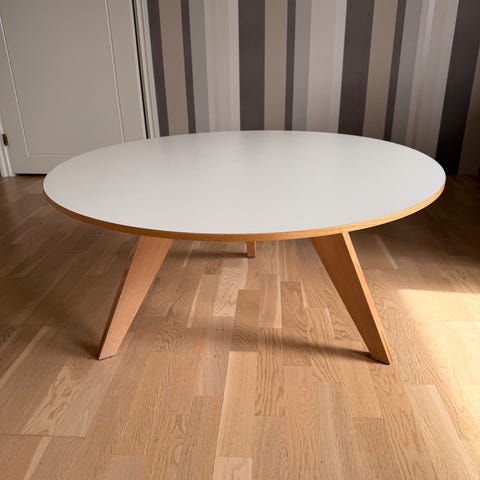 Stilreint og moderne salongbord med rund bordplate og elegante, bua bein. Bordet er pent brukt og utan synlege bruksmerker. Stabilt og solid, og passar godt inn i både moderne og skandinaviske heimar. Må hentes
