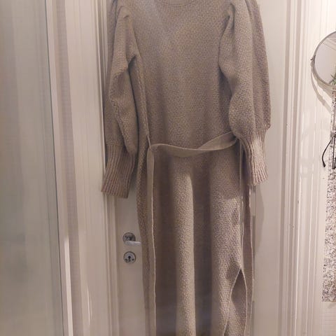 By Lien hverdagskjole i svart ull for dame i størrelse L. Kjolen har lange ermer med ribbestrikkede mansjetter og rund hals. Den leveres med knytebelte i livet som kan justeres etter ønsket passform. Materialet i ull gjør kjolen egnet til bruk på kjøligere dager. Passer som hverdagskjole og til enkle, pene anledninger.