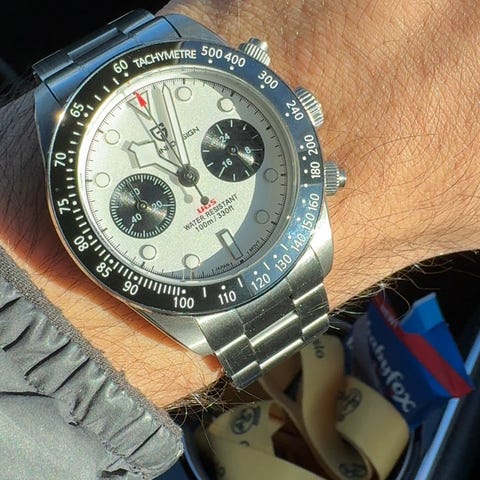Klokken kommer med 2 sorte originale gummireim, brun racing skinnreim som er på klokken nå, nylon reim med flagg, og en original 4 klokkers klokkerull. Original skinnreim følger og, men den er deffekt, om noen vil prøve å ordne den, eine quickrelease som er revet.