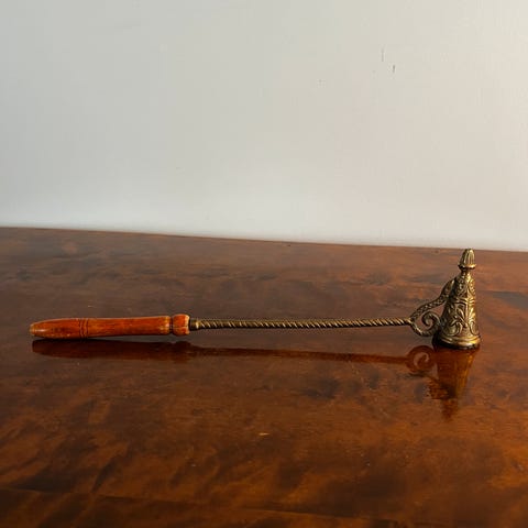 Elegant lyseslukker i massiv messing med lang arm og dekorativ klokkeform.