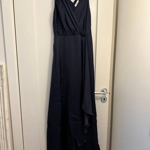 Bubbleroom festkjole for dame i størrelse XL. Lang kjole i blå polyester med glittereffekt. Modellen har omslagsutringning foran, bred midje og vidt fall i skjørtet. Skjørtet har splitt i siden, og kjolen lukkes med glidelås bak. Egnet til formelle anledninger som fest, bryllup eller andre selskapelige sammenkomster.
