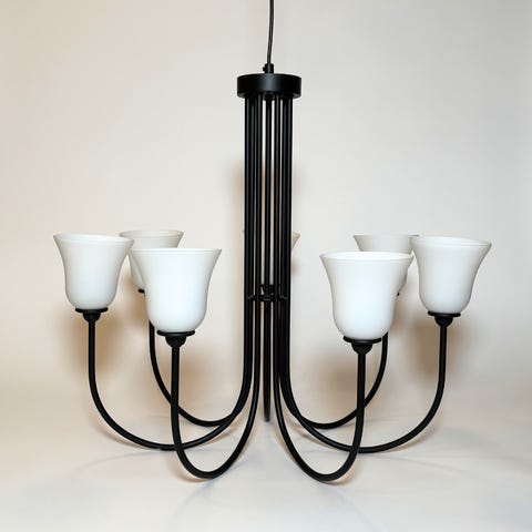 Selger en pen og solid taklampe/lysekrone med 5 lyspunkter. Lampen har sort metallramme med dekorativ midtsøyle og hvite/frostede glasskupler som gir et varmt og behagelig lys.