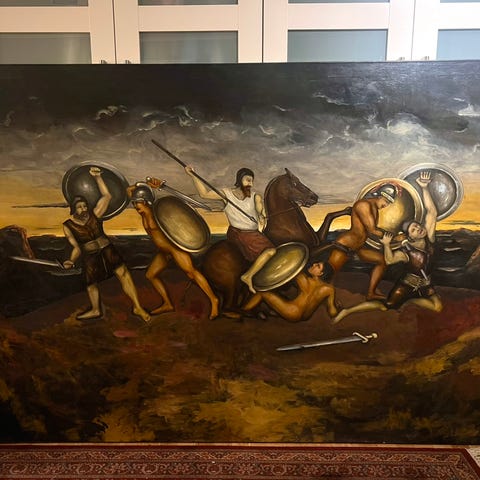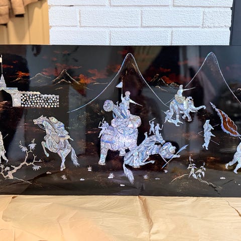Veggbilde med motiv av asiatisk landskap og landsbyliv. Motivet viser mennesker, dyr og trær i en horisontal komposisjon. Bildet er rektangulært og har mørk bakgrunn med lyse detaljer i motivet. Baksiden har opphengsfester for montering på vegg.