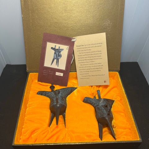 Veggbilde med dekorativt asiatisk motiv. Motivene viser figurer og ornamenter i lyse toner mot mørk, hovedsakelig svart bakgrunn med innslag av rødt og brunt. Hvert panel har oppheng på baksiden for montering på vegg.