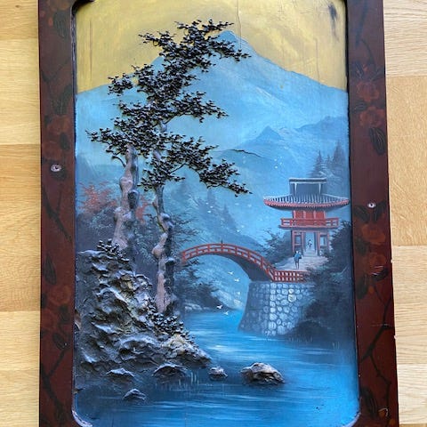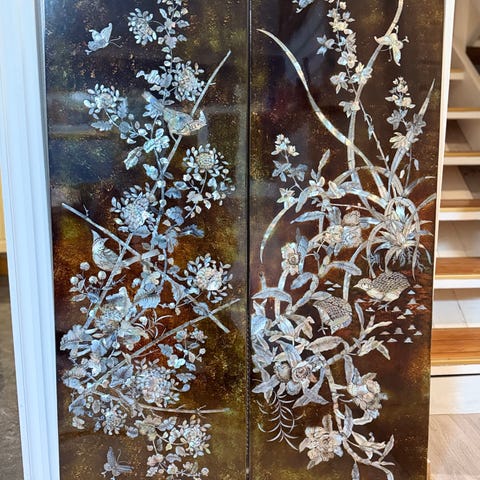 Vakker veggbilder dekorative paneler i to deler med brun bakgrunn og detaljert motiv av blomster, fugler og natur. Panelene har et orientalsk preg med innlagte lyse mønstre.