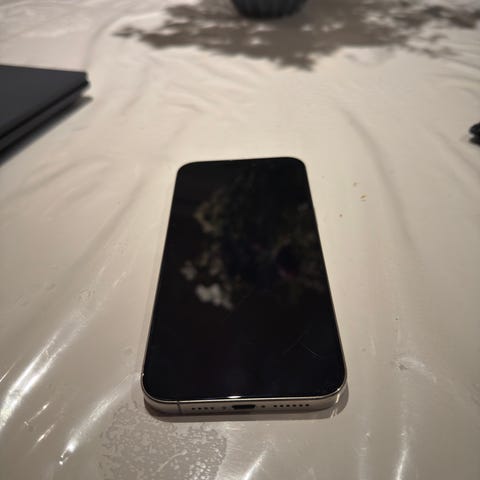 Apple iPhone 15 Pro Max smarttelefon med 256 GB lagringskapasitet. Telefonen leveres med original eske og tilhørende ladekabel slik det vises på bildene. Modellen har stor skjerm med frontkamera i skjermutskjæring og trippelt hovedkamera på baksiden. Farge: svart.