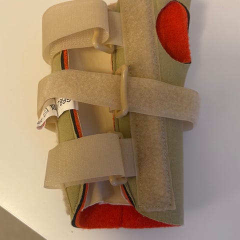 Futuro håndleddstøtte i størrelse medium i beige farge. Modellen har justerbare stropper med borrelås for tilpasning rundt håndleddet. Støtten er laget i et mykt, tekstilbasert materiale med forsterket plate på undersiden for stabilisering av håndleddet. Egnet som støtte ved behov for avlastning og stabilitet i håndleddsområdet.
