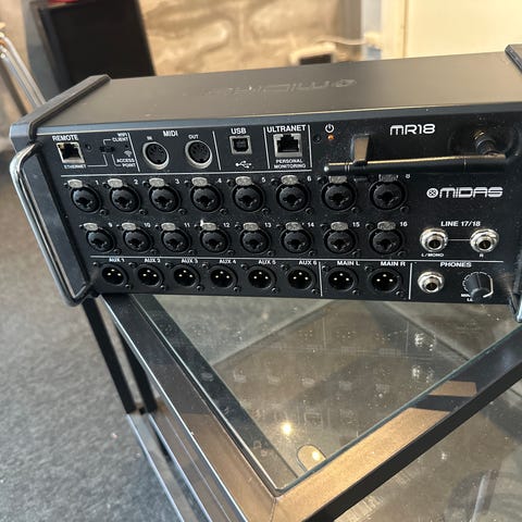 DL32 i rack med rgb svanehalslys og strømdistro med volt og ampermeter.