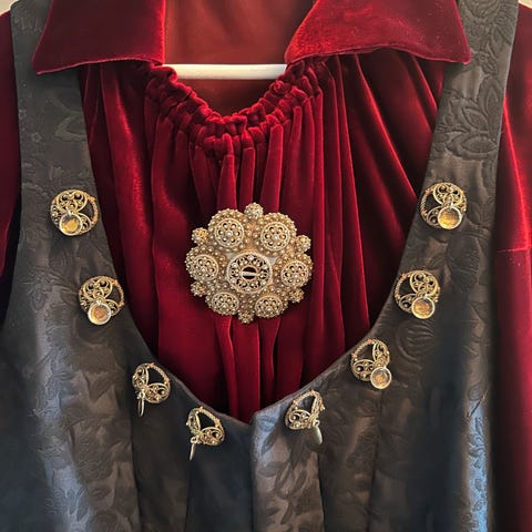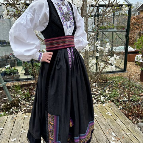 Nydelig lilla beltestakk sydd, brodert og montert av Almankås i Bø vurderes solgt.