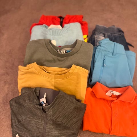 Pakken inneholder klær til hele årstiden. Her er det ull, tykke gensere, tynne gensere, t-skjorter, skjorte, skjorte, olabukser, joggebukse.