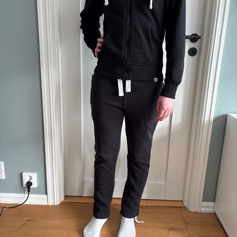 University joggedress i mørk blå farge. Sett med hettejakke med glidelås og bukse med stramming i livet. Innsiden er myk og fleeceaktig for ekstra komfort og varme. Passer til hverdagsbruk, innebruk eller som kosedress. Merkelapp på innsiden for navn og tilhørighet (school/phone/name). Materialinformasjon er ikke oppgitt på lappen, men stoffet fremstår som en typisk joggedress-kvalitet i myk bomulls- eller bomullsblanding.