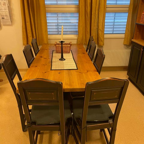 Dovre møbel fra 1997 selges da vi ikke lenger trenger det. Bruksmerker finnes, men ingen spesielt alvorlige. Noen stoler er litt ustø, noen av stolene er sikret med treskruer og beslag under setet. Pent stoff i stolputer og Slagbenk.