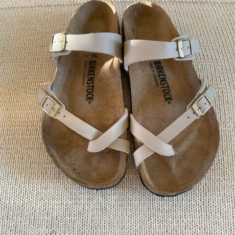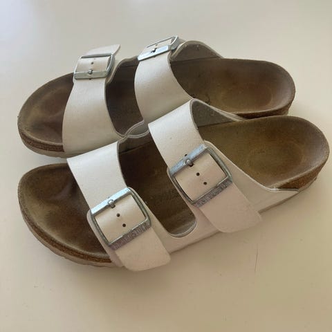Birkenstock sandaler i størrelse 37. Modellen har to justerbare remmer med metallspenner og overdel i lys, hvitaktig farge med diskret leopard mønster. Fotsengen er formet for støtte til fotbue og hæl. Yttersåle i slitesterkt materiale egnet til hverdagsbruk både inne og ute. Lite brukt! Kjøpt sommeren 2025
