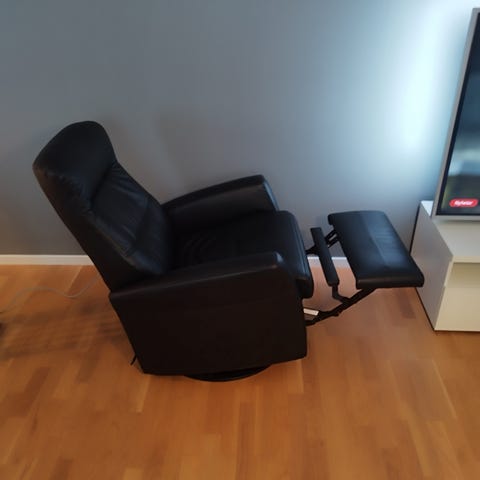 lenestol med fotskammel. Begge i sort skinn.