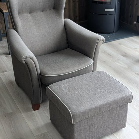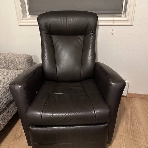 Pent brukt hvilestol og i god stand selges grunnet har ikke plass. Hvilestolen er kjøpt på fagmøbler. Hvilestolen er i brunt skinn og har regulerbar rygg. Må hentes