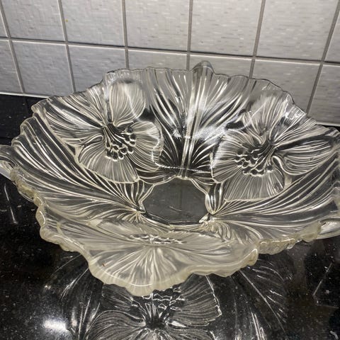 glassfat med fiskemotiv. Fatet er formet som en fisk og er laget av klart glass med preget mønster i bunnen. Egner seg til servering av for eksempel fiskeretter, pålegg eller snacks, eller som dekorasjonsfat på bord eller kjøkkenbenk.