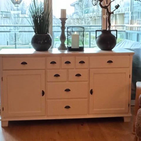 Koselig skjenk med skuffer øverst og hylleplater inni. Selger vitrineskap i samme serie.