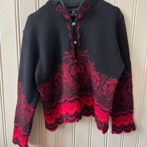 Hjemmestrikket for dame i størrelse M. Cardiganen er laget i ull og har rød bunnfarge med flerfarget mønster øverst, nederst og på mansjettene. Den har knappelukking foran og er helfôret på innsiden. Egnet som varm og behagelig overdel til hverdagsbruk og andre anledninger.