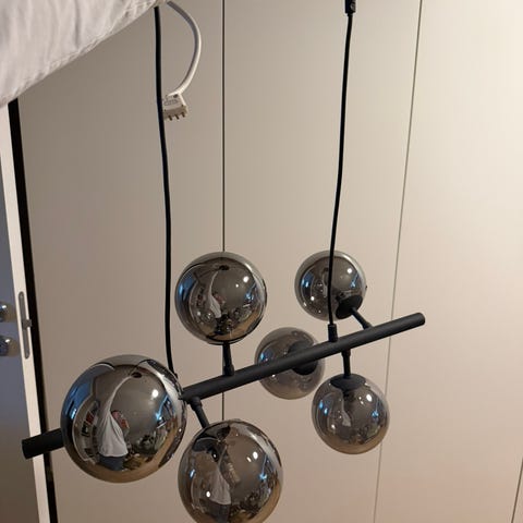 Selger min helt fantastisk bronze taklampe med elegante glasskuler i forskjellige størrelser. Lampen ble kjøpt til spisestuen, men dessverre passer den ikke til vårt takoppheng – derfor må vi bestille en annen løsning.