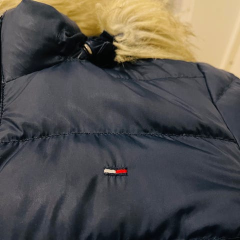 Dejlig dun parkas i meget pen stand. Mørkeblå med juksepels rundt hetten. To lommer med glilås. Den ene av glilåsene i lommen har gått i stykker. Jeg opfatter den som litt lille i størrelse.