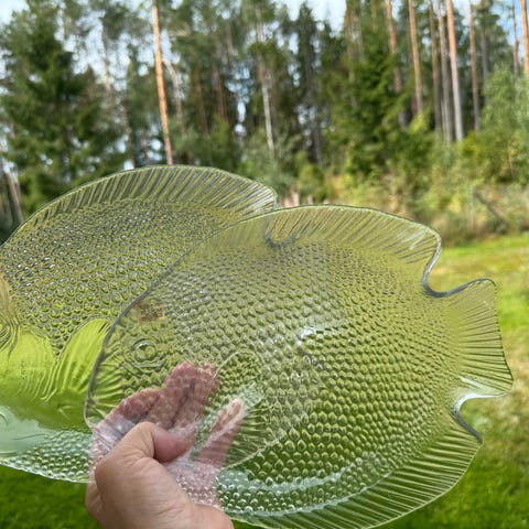 Tallerkenene er i svært god stand, nesten ikke brukt, og uten sprekker eller skader. Klart og fint glass med det klassiske fiskemotivet.