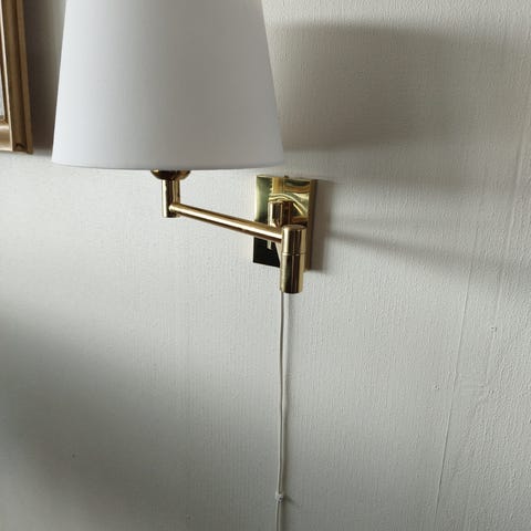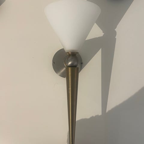 Moderne vegglampe med skjerm av hvit opal formet som en slangs sylinder.