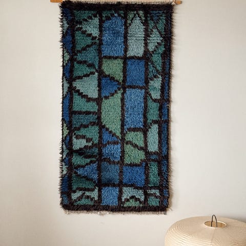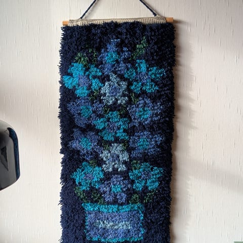Veggteppe i ull med flerfarget mønster i blå, grønne, gule og hvite toner mot mørk bakgrunn. Rektangulær form, egnet som veggdekor i stue, gang eller andre oppholdsrom. Tekstilt veggteppe som kan bidra til å dempe lyd og gi et mykere uttrykk i rommet.