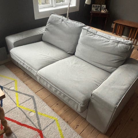 Kjempe myk og god sofa selges. Dun i ryggoperert og sitteputer. Fantastisk å sitte og ligge i😍 Den har dessverre begynt å rakne i stoffet på den største modulen. så den selges egentlig som en 2-seter, Men den andre delen følger selvfølgelig med om ønskelig.