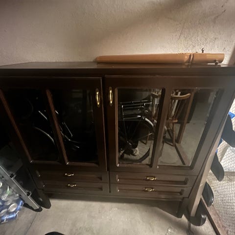 Vitrineskap med masse skap og skuffer.