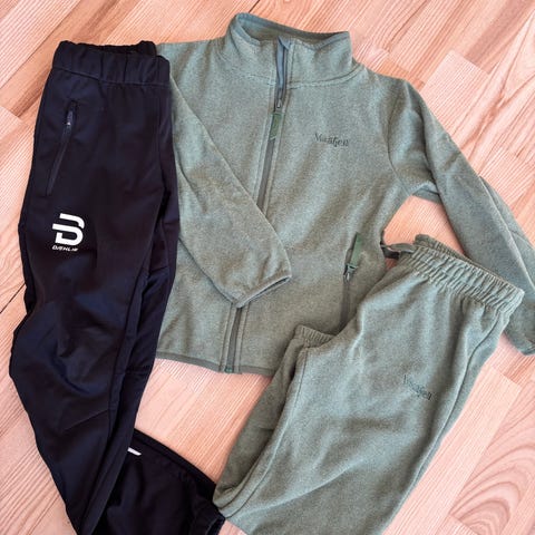 Bjørn Dæhlie treningsdress i størrelse 128. Sett med jakke og bukse i blå og svart farge. Jakken har glidelås foran og høy krage. Buksen har strikk i livet og rette ben. Passer til ulike typer aktivitet, bl.a. langrenn.