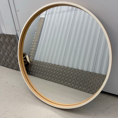 2 stk Mira speil med diameter på 50cm og 70 cm. Speilene har en tynn ramme i gullfarge. Passer til bruk på vegg i for eksempel gang, soverom eller stue. Også fint til borddekorasjon. Selges samlet for 400kr