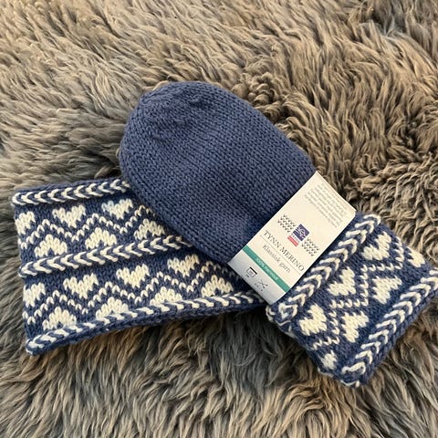 Hjemmestrikket votter og ørevarmer/pannebånd