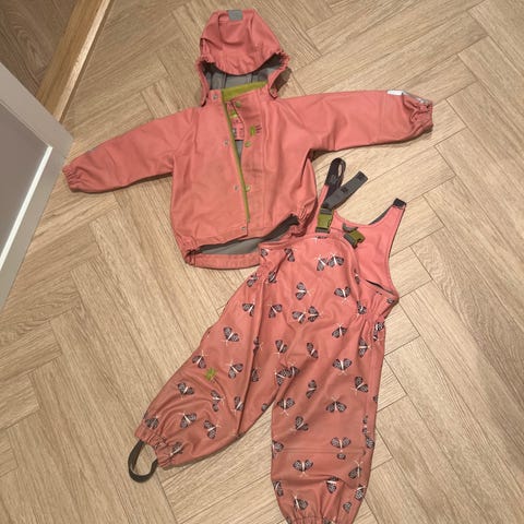 Kattnakken regntøysett for barn i størrelse 86, unisex. Settet består av regnjakke med hette og regnbukse med seler. Farge oransje. Jakken har glidelås og trykknapper foran, samt mønstertrykk. Buksen har justerbare seler og strikk nederst i beina. Materiale i polyester. Egnet som yttertøy i vått vær for små barn.