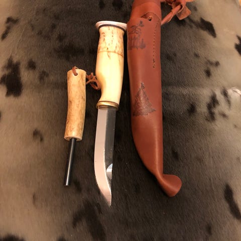 Ubrukt STAK samekniv fra Strømeng i Kautokeino fra ca 1995. Utgått modell med messing innlegg i skaft. Dagens modell har ikke det.