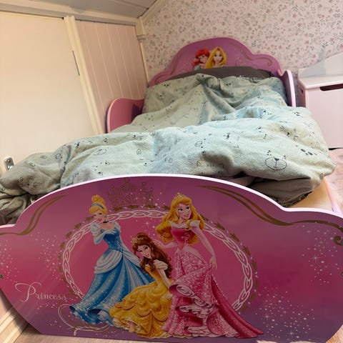 Vi skal bytte til køye seng. Sengen er kjøpt brukt for ett år siden. Den har en liten knekk ved den ene skruen. Små barn kan fortsatt sitte der😊 Må hentes!