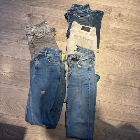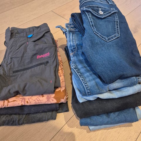 En klespakke med seks forskjellige bukser. Fem dongeribukse og en joggebukse. Mellom str 146-158.