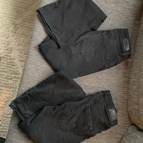 5 bukser, 2 sorte, 1 mørk blå og 2 hvite ( den ene med merkelappen på). Alle XL og med stretch. Beklager dårlig fargegjengivelse, men de sorte er helt sorte.
