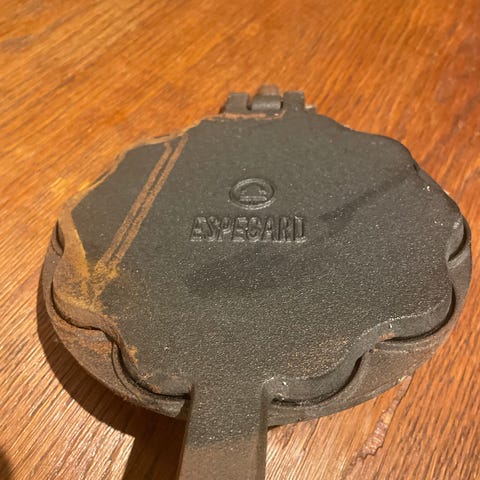 Staal toastjern i støpejern med langt skaft og trehåndtak. Jernet har to kvadratiske former som lukkes sammen med hengsel og låsemekanisme, egnet for tilberedning av toast eller varme smørbrød over bål eller annen varmekilde. Håndtaket i tre gir bedre grep og beskytter mot varme. Passer til tur, camping og bruk utendørs der man har åpen flamme eller grill.