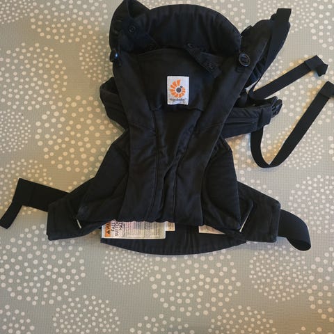 Bæreselen er svart men blitt litt bleket i vask. Ellers er den i svært god stand og er veldig behagelig på for både bærer og barn :)