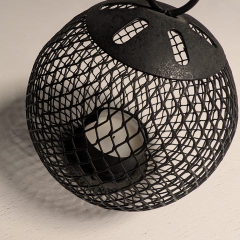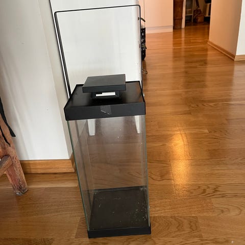 lyslykt i metall med glassylinder. Lysholderen henger i en stående metallstang med rund fot. Tilpasset telys.
