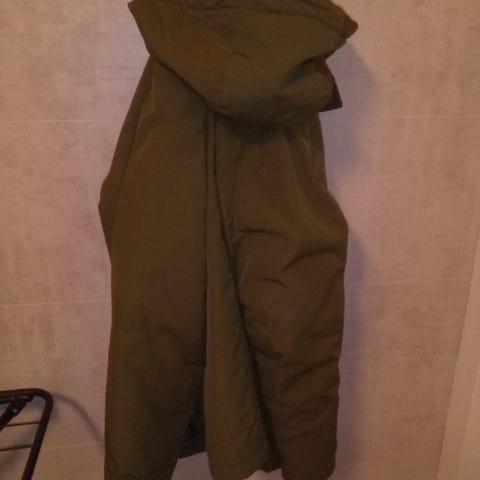 Solid foret varm vinterjakke med avtakbar hette. Jakken er vasket i maskin og fremstår nesten som ny. Fargen er svart, men de fleste bildene har fått mye lys og kan gi et noe feil inntrykk.