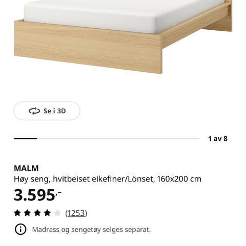 MALM seng (eksl. madrass) fra IKEA med 4 oppbevaringskuffer og hodegavl i hvitbeiset eikefiner. Ribbebunn inkl.